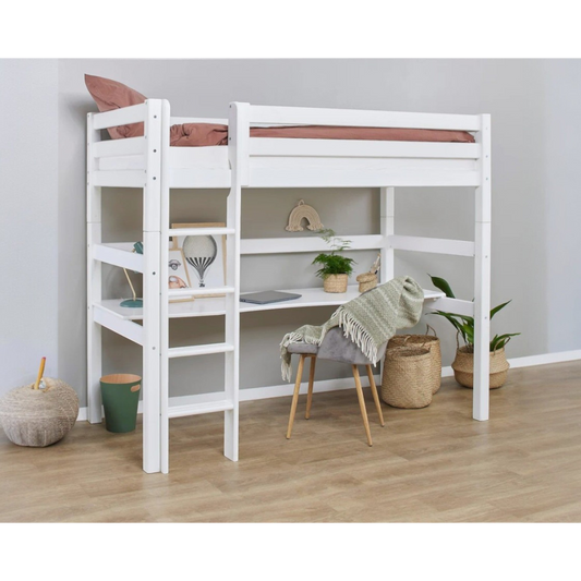 Lahe - Kõrge voodi kaldredeli ja nurgalauaga - 90x200cm - Valge