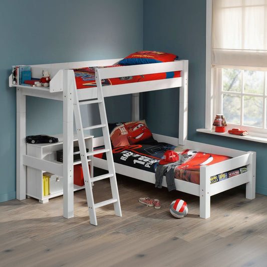 Lahe - Kampinė dvigulė lova su įstrižomis kopėčiomis - 90x200 cm - Balta